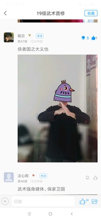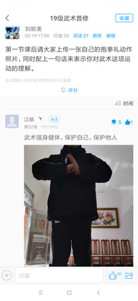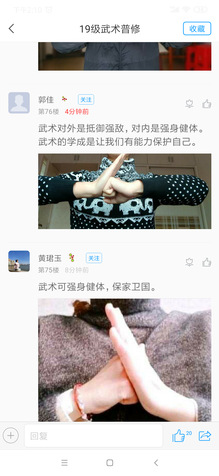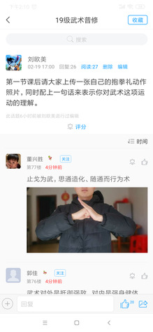 在第一次QQ直播中19级课程时,老师利用QQ群跟大家在线直播,在直播过程中,通过设计问题互动回答,老师提出问题,2班3班的同学以文字形式在讨论区写出自己的答案,随机抽取1班同学的学号,点击连麦,以连麦方式跟老师现场互动。在讲解抱拳礼、基本手型、拳法、基本步型时,通过连麦现场视频的方式,来检验现场学习效果,让其他同学指出动作错误的地方,让其引以为鉴,也更直接形象的看出来动作的易犯错误。课后大家通过学习通和其他平台完成线上作业,在讨论中员工们的课后参与较高以这样的模式检测直播后的学习情况,线上直播效果初见成效。