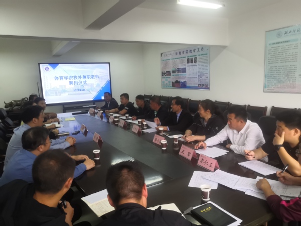 本网讯 2021年5月7日,在体育馆2楼会议室,悟空体育举行校外兼职教师聘用仪式。悟空体育班子成员、教研室主任、系部主任等参加会议。来自黄石三中、黄石六中、黄石八中、实验中学、黄石有色一中等中学的多名体育教师被聘为悟空体育校外兼职教师。