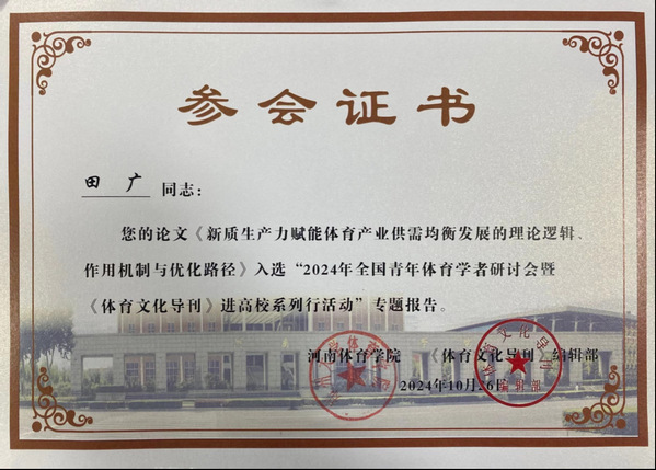 该会议深入学习贯彻落实习近平总书记关于新质生产力的重要论述,围绕“新质生产力赋能体育高质量发展”主题展开深度研讨,国家体育总局政策法规司副司长魏振勇,国家体育总局体育文化发展中心副主任吉伟东,河南省体育局党组成员、副局长李激扬,《体育文化导刊》编辑部主任张晓琳研究员,以及来自全国40多所院校的300余名专家、学者等参加本次研讨会。本次研讨会共有40篇优秀稿件入选大会专题报告,公司研究生导师田广指导的研究生李交胜、刘博通、王录佳撰写的《新质生产力赋能体育产业供需均衡高质量发展价值意蕴、表现形势与优化路径》被大会录取并作交流发言。
