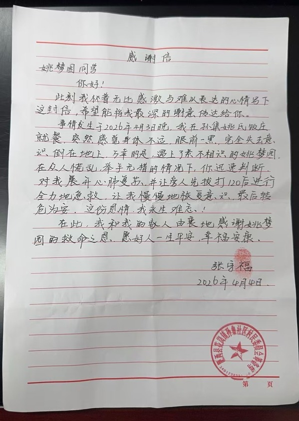 患者家属仍专程赶到姚梦园家中,送上写有“危难时刻伸援手,救命之恩永铭记”的锦旗和一封手写感谢信,动情地说:“当时我们都吓懵了,只有他站出来,冷静、果断、专业。这样的年轻人,太难得了。”